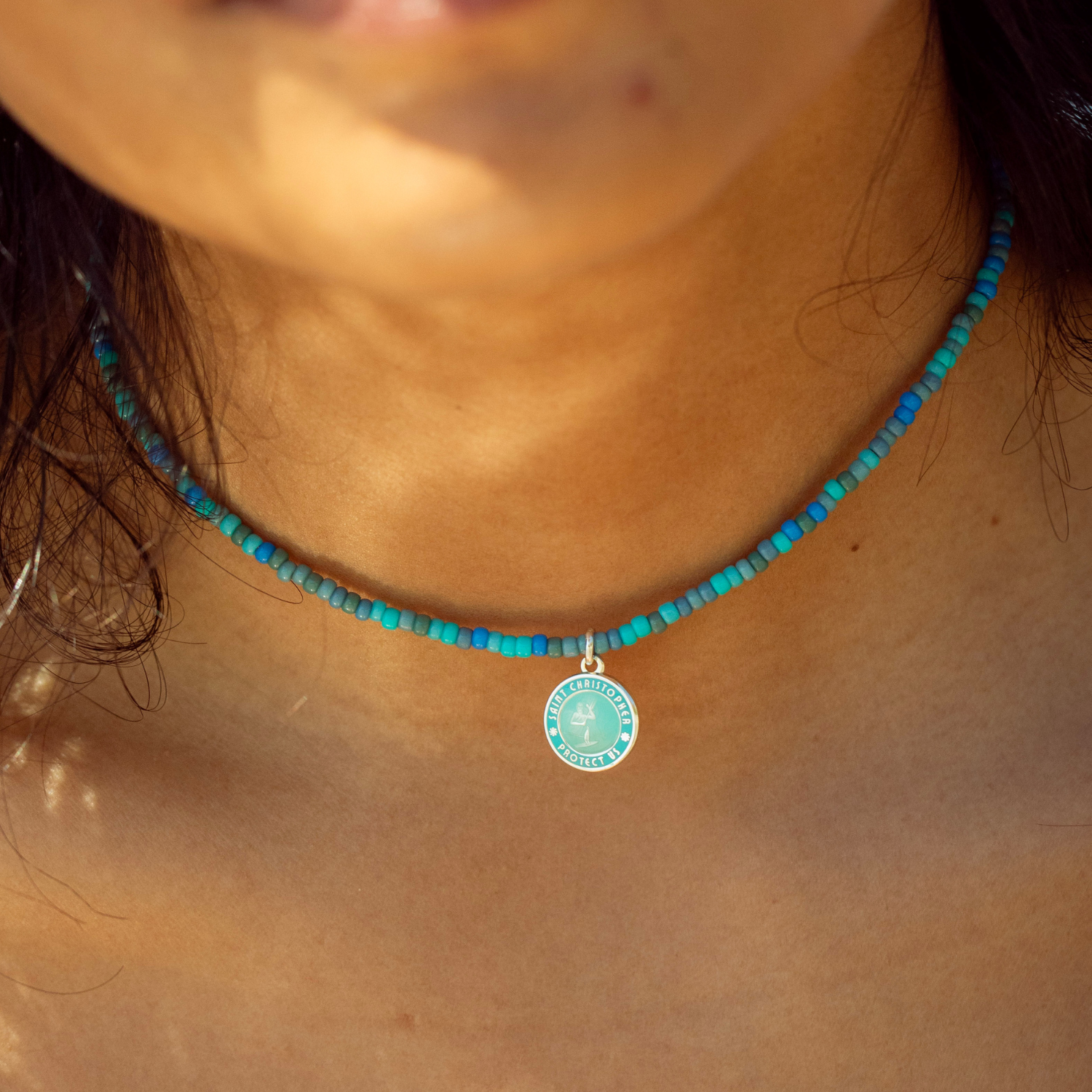 Dive into adventure with the Blue Lagoon Beaded Choker! Featuring vibrant blue seed beads and a Teal / Teal St. Christopher pendant, this choker is made for ocean lovers and explorers. Wear it as a symbol of protection and a reminder of endless summer days by the sea.
