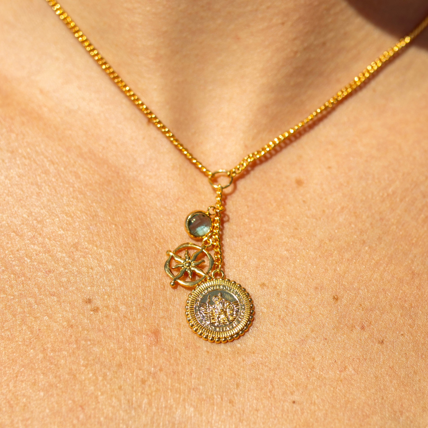 - Features a St. Christopher coin pendant, compass charm and aqua gemstone