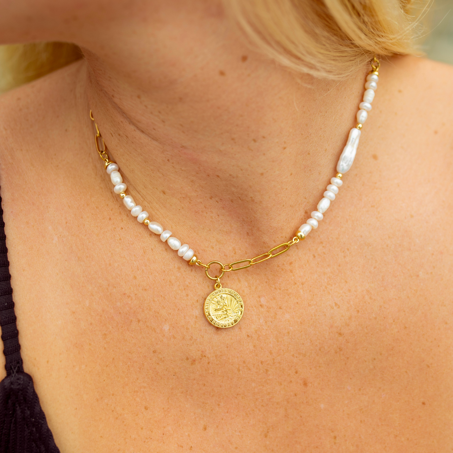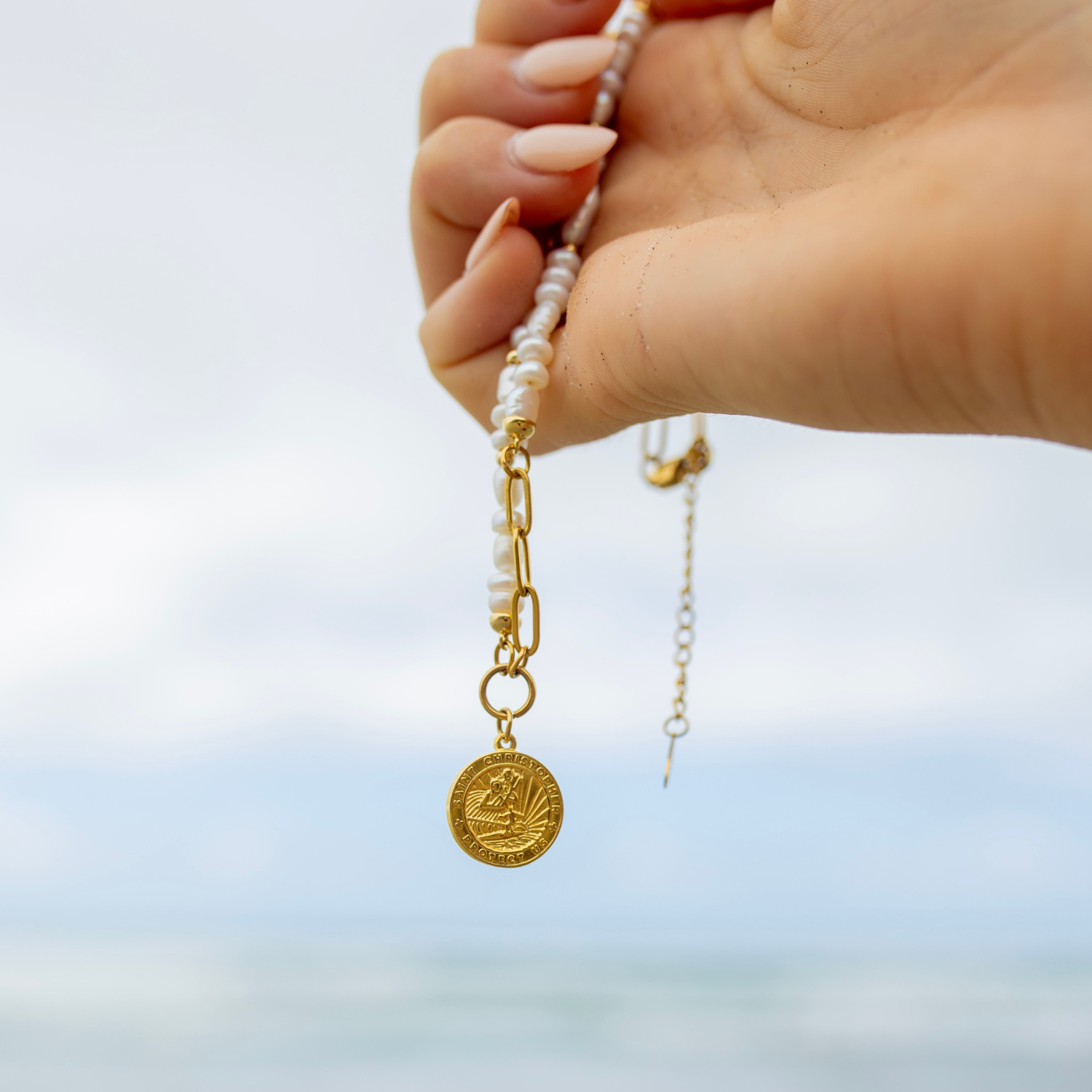 Slip into laid-back luxury with our Laguna Shores Necklace — where coastal charm meets timeless elegance. Featuring our iconic St. Christopher pendant for safe travels and seaside adventures, this piece blends lustrous pearls with a golden paper clip chain for an effortlessly elevated look.