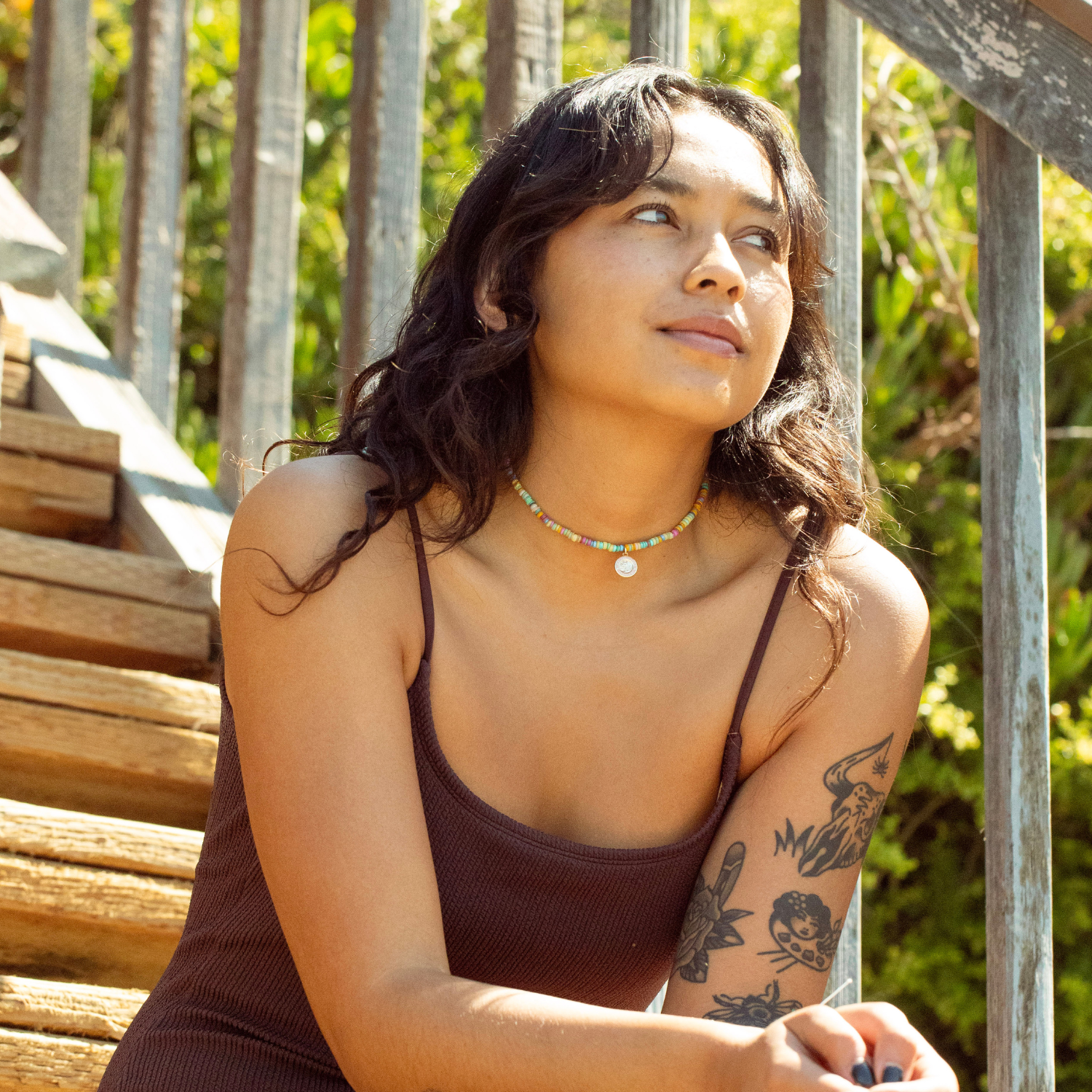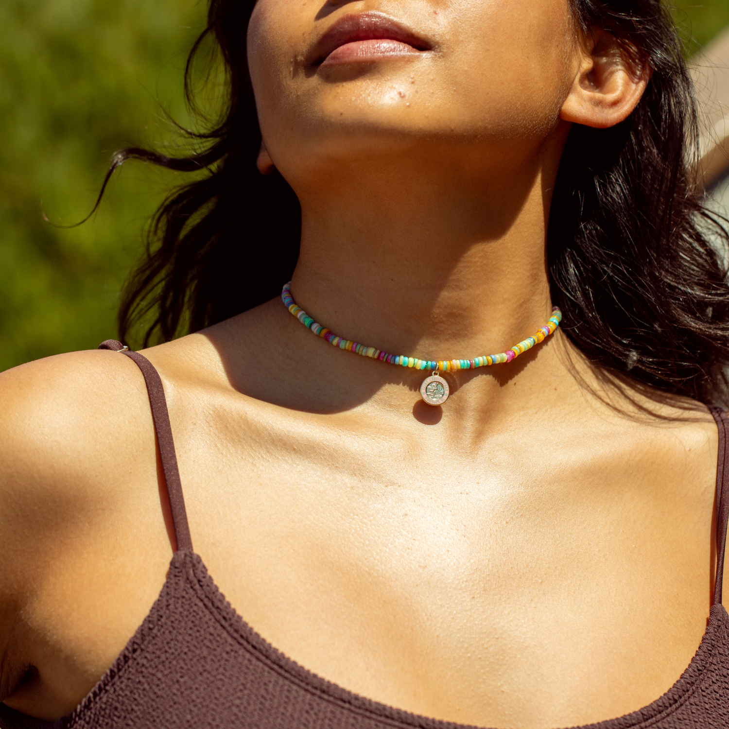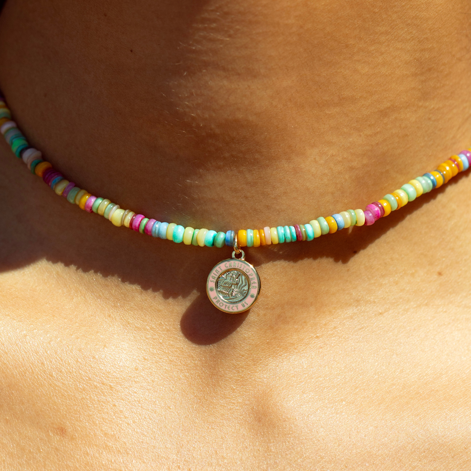 The Pastel Sunsets Beaded Choker now in gold! This choker is a dreamy mix of soft, beachy hues. Featuring colorful beads and a small gold pink St. Christopher pendant, it is the perfect blend of good vibes and timeless protection. Wear it as a daily reminder of golden hour skies and endless adventures!