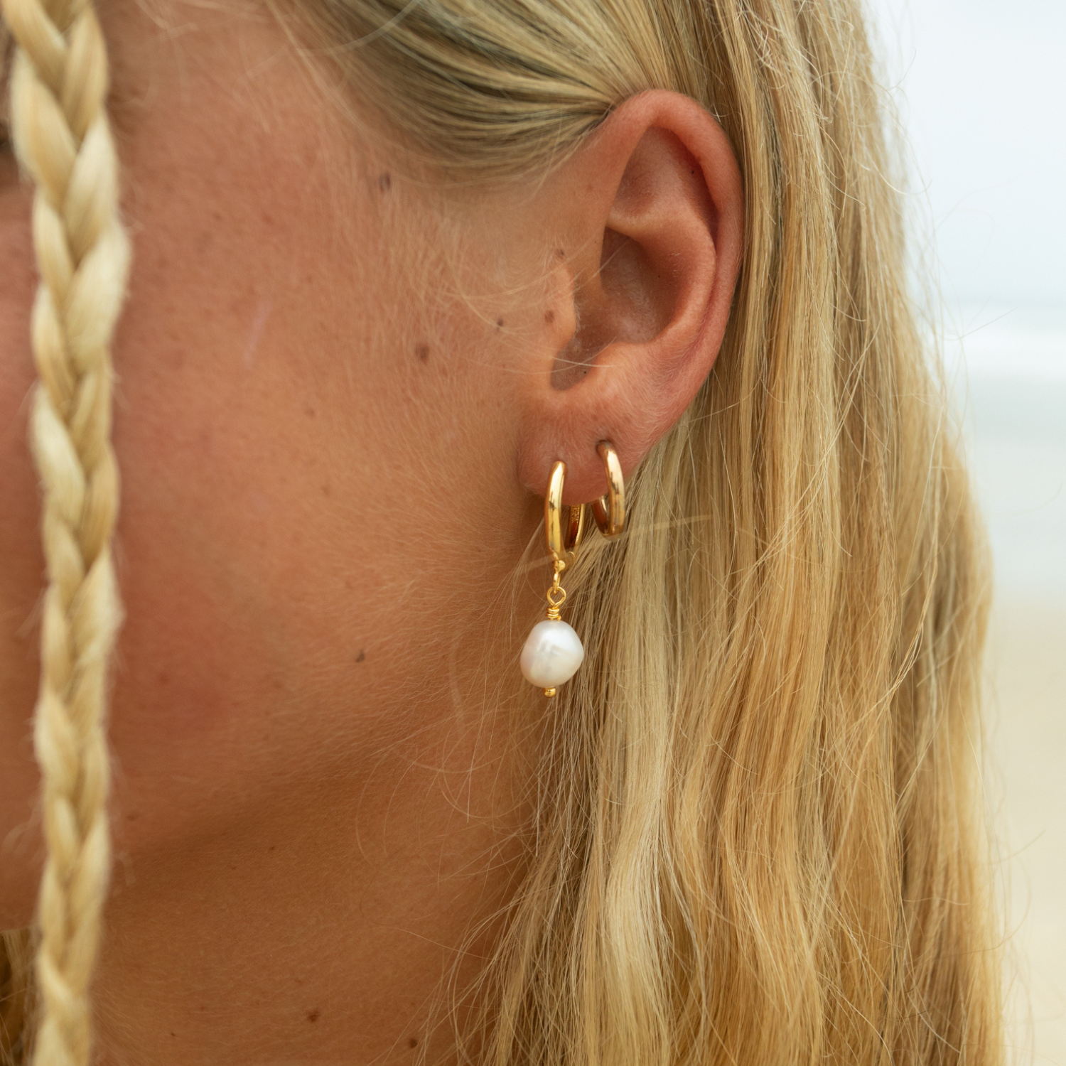 Revealing the Shoreline Pearl Hoop Earrings! These beachy beauties feature radiant freshwater cultured pearl beads which add a touch of ocean-inspired elegance to any outfit. Perfect for any beach day or coastal adventure!