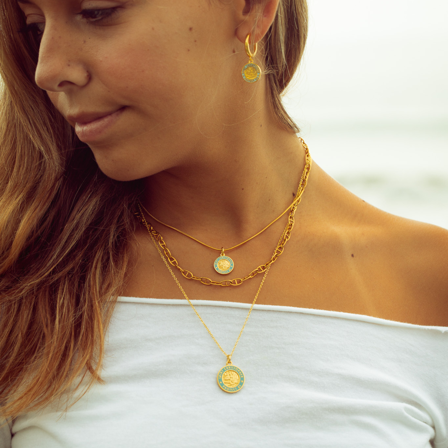 Travel in style with our new Gold Baby Blue St. Christopher Earrings, featuring the patron saint of travelers in an elegant baby blue enamel finish set against a gleaming gold frame. These earrings are perfect for those seeking both protection and a pop of color in their daily outfits.