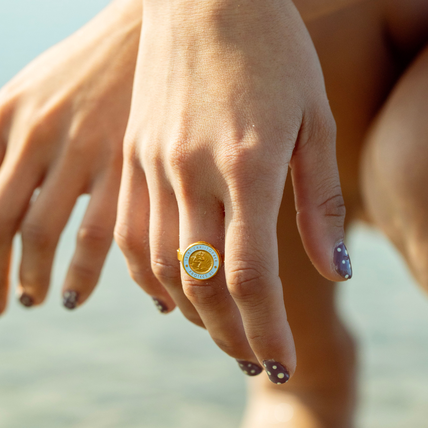 Introducing our new Gold Baby Blue St. Christopher Ring—a fan favorite, now in a ring! With its vibrant baby blue and gold design, this piece is perfect for beach lovers, surfers, and adventurers seeking style and protection.